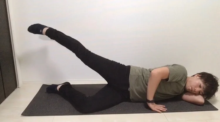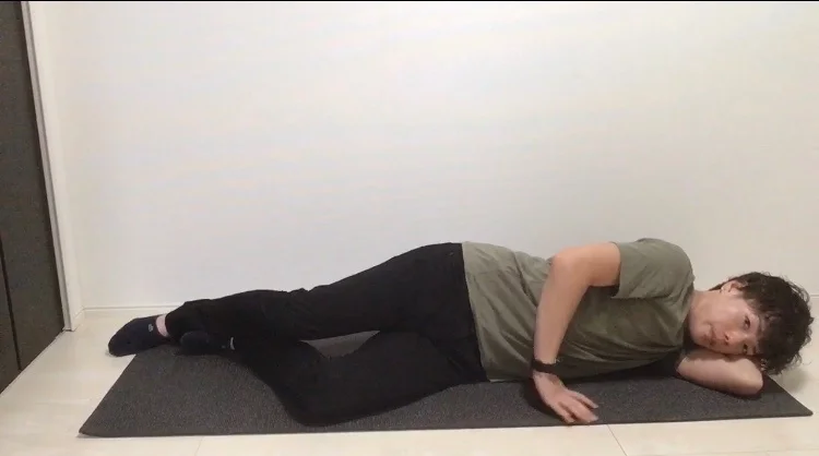 ① 横向きの状態で寝て、上側の脚を伸ばす。