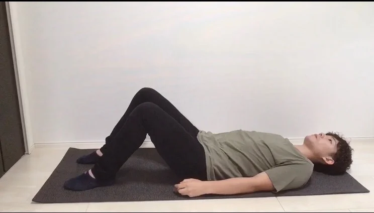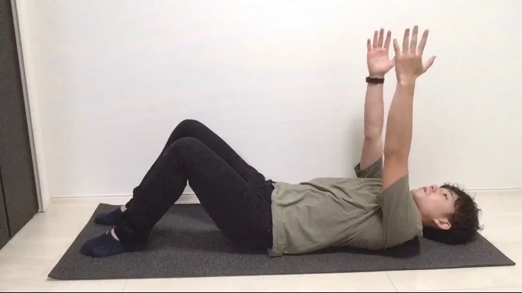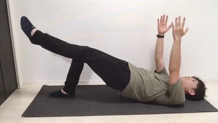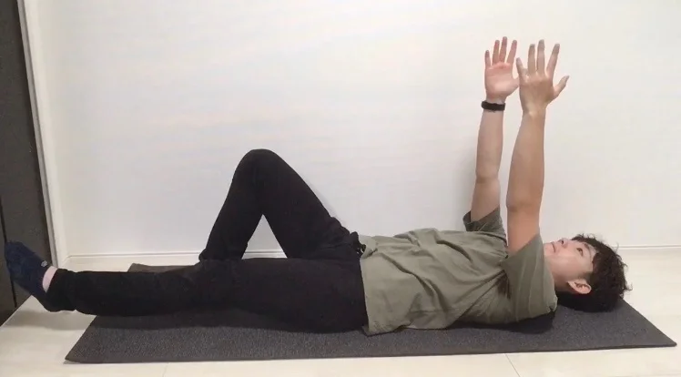 - 仰向けで両手を挙げ、片膝を伸ばす