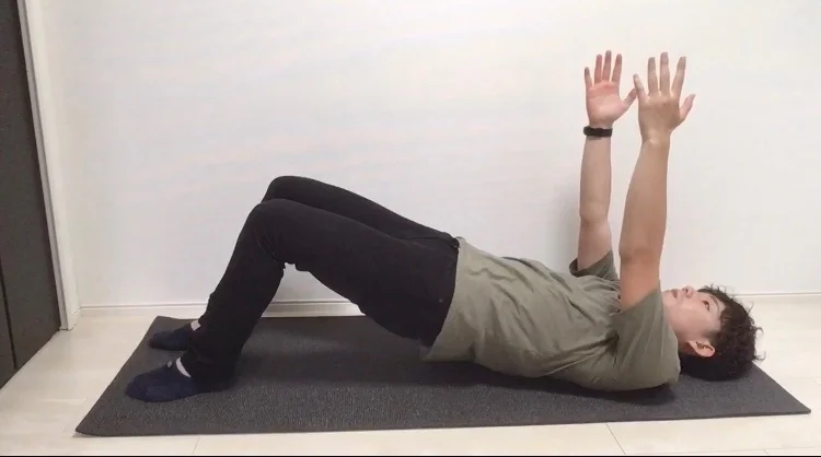 両手をバンザイすることで肩甲骨周りの動きが安定し、お腹の筋肉に力が入りやすくなる(腹圧の上昇)、 左右の偏りが修正できる(正中位指向)等の効果が期待できます。