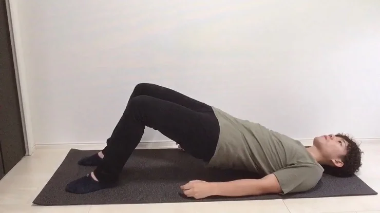 ② 息を吐きながら足の裏で床を押すように骨盤→背中の順番にお尻を持ち上げる